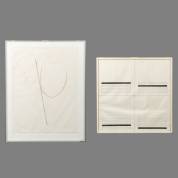 Twee werken: Carel Visser (1928-2015), compositie in zwart en wit, zeefdruk r.b. gesigneerd en gedateerd '68 -waterschade-, 49 × 49 cm, en Jan Montijn (1924-2015), lijnencompositie, kleurenets, eigen druk 7/7, r.o. gesigneerd en gedateerd 1966 -roestvlekjes-, 61 × 46 cm