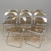 Acht buisframe klapstoelen met bruine plexiglazen rug en zitting, model Plia, ontwerp Giancarlo Piretti, uitvoering Castelli, Italië, jaren '60 -gebruikssporen-