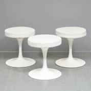 Drie krukjes met draaibare witte faux lederen zitting en witgelakte metalen voet, ontwerp Eero Saarinen, uitvoering Rudi Bonzanini -gebruikssporen-, 43 × Ø 38 cm