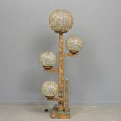 Vierlichts goud- en groengeschilderde metalen staande lamp met vier Muranoglazen kappen, vergelijkbare lampen toegeschreven aan Biancardi & Jordan, jaren '60 -één glazen kap gelijmd-, 142 × 54 × 30 cm