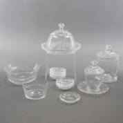 Zestiendelig glazen serviesgedeelte, waaronder: schaal, jampot, botervloot, elf kleine schotels, vingerschaal en een pot, model 'Spectrum', ontwerp W.J. Rozendaal, 1928, uitvoering Kristalunie Maastricht, gemerkt, botervloot 15 × Ø 21 cm