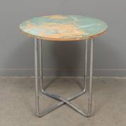 Bijzettafeltje met rond berkenmultiplex blad op buisframe onderstel -laklaag in verregaande staat van verval-, 62 × Ø 60 cm