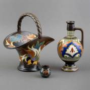 Plateel hengselmand met gestileerd floraal decor, uitvoering Zenith, Gouda, plateel schenkkan met gestileerd floraal decor, uitvoering Plateelbakkerij Zuid-Holland, Gouda, en klein vaasje, decor Polo, uitvoering Plateelbakkerij Ram, Arnhem, jaren '20, hengselmand 26 × 24,5 × 18 cm