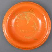 Diep aardewerk bord met oranje-goud vissendecor, ontwerp Leen Muller, uitvoering Plateelbakkerij Zuid-Holland / Plazuid, circa 1930, Ø 21,7 cm