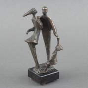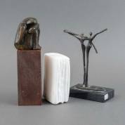Drie sculpturen: Anton Geerlings (1923-2018), boekje, albasten sculptuur, gemonogrammeerd, 11 × 8 × 4,5 cm, inclusief kopie aankoopbewijs; Corry Ammerlaan-van Niekerk (1947), twee staande figuren, brons, gesigneerd, op natuurstenen basement, 17 × 13 × 5,5 cm inclusief basement; en bronzen sculptuur: knielende figuur, op onderzijde gemonogrammeerd M, 8 × 5 × 6 cm, met los houten basementje