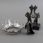 Drie sculpturen: Corry Ammerlaan-van Niekerk (1947), 'I give you warmth', brons, 9 × 6 × 6 cm; vermoedelijk Corry Ammerlaan-van Niekerk (1947), chroomkleurige metalen cirkel met figuren, 6 × Ø 19 cm; en Bernadette Leijdekkers (1949), trapeze van zes figuren, brons, op achterzijde gesigneerd, op natuurstenen basement met plaquette, 16 × 12 cm