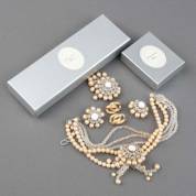 Parure met faux parels en geslepen glasstenen, bestaande uit: collier, paar oorclips, en broche, daarbij: paar vergulde oorclips, in originele doosjes, Christiaan Dior, Parijs -gebruikssporen en defecten-, lengte collier 40 cm