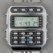 Stalen herenpolshorloge, Casio Data Bank, met digitaal scherm en diverse functies zoals rekenmachine, aan originele stalen band, referentienummer: CD-401 1e generatie, circa 1980, 40 × 34 mm -lichte gebruikssporen-