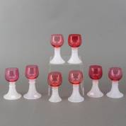 Acht cranberryrode glazen op opaline voet, eerste helft 20e eeuw -drie glazen met randschilfers-, circa 13 cm