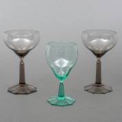 Meerblauw rijnwijnglas en twee rookkleurige champagneglazen van het servies Peer, ontwerp A. D. Copier, uitvoering Glasfabriek Leerdam, 1927, gemerkt -één champagneglas met chipje aan de voet-, hoogte champagneglas 16 cm