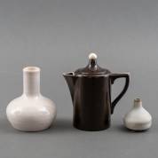 Bruingeglazuurde warme melkkan met witte accenten, ontwerp Chris van der Hoef, uitvoering Plateelbakkerij Haga, 1904-1907, gesigneerd, daarbij: witgeglazuurd flesje, ontwerp Wim van Ham, en witgeglazuurd flesje, ontwerp Frans Slot, melkkan 13 cm