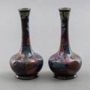 Paar plateel steelvaasjes, uitvoering Plateelbakkerij Zuid-Holland, Gouda -één vaasje met twee chips van standring-, hoogte 15,5 cm
