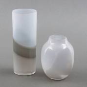 Twee vaasjes, grijs en wit decor, serica, ontwerp Floris Meydam, uitvoering Royal Leerdam, hoge vaas nr. 50 - 40, lage vaas nr. 250 - 43, hoogste 16 cm
