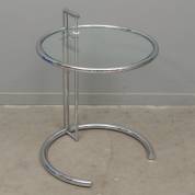 Ronde bijzettafel met metalen onderstel en in hoogte verstelbaar glazen blad, reproductie naar ontwerp van Eileen Gray, uitvoering onbekend -enkele krasjes in blad-, 66 × Ø 50,5 cm