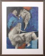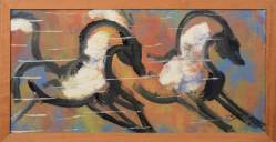Schilderij: twee geabstraheerde paarden, olieverf op doek, r.o. onduidelijk gesigneerd, verso met opdracht aan eigenaar -enkele gaatjes-, 30 × 60 cm
