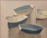 Willemijn van Dorp (1945), vier bootjes op drooggevallen strand, olieverf op board, r.o. gemonogrammeerd, 40 × 50 cm