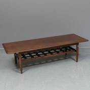 Hardhouten salontafel met etagère van gevlochten vinyl singels, uitvoering Topform, jaren '60, 44 × 157 × 57 cm