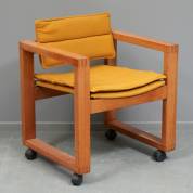 Teakhouten stoel met okergele stoffen bekleding, staand op wieltjes, ontwerp Ate van Apeldoorn, uitvoering Houtwerk Hattem, jaren '60/'70 -lijmvlekken op onderzijde van het zitkussen, wieltjes vermoedelijk niet origineel-
