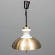 In hoogte verstelbare hanglamp met goudkleurige kap om opaline diffusor, jaren '60/'70, Ø48 cm
