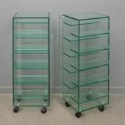Twee geheel glazen vitrinekasten met over de diepte gedeelde plankjes, staand op wieltjes -kleine beschadiging hoek boven-, eind 20e eeuw, 91 × 38 × 28,5 cm