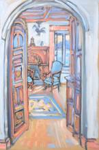 Jeffrey Hessing (1952), woonkamer met schouw, olieverf op doek, r.o. gesigneerd en verso gedateerd '91, 81 × 54 cm