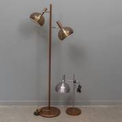 Twee lampen: vloerlamp met twee verstelbare 'rookglazen' kunststof kappen, en tafellamp met verstelbare kunststof kap, beide vermoedelijk uitvoering Dijkstra, jaren '60, vloerlamp 152 × 57 cm