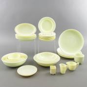 Persglazen groen 'Colopal' serviesgedeelte, ontwerp A.D. Copier, bestaande uit: drie schalen, negen kommen, zes terrines, tien borden, roomstel, bakje, suikerpot, en potje -gebruikssporen en kleine defecten-, grootste kom 7 × Ø 27 cm
