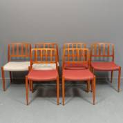 Zes teakhouten stoelen waarvan vier met rood stoffen bekleding en twee met witte, model 83, ontwerp Niels Otto Møller, uitvoering JL Møllers Møbelfabrik, Denemarken