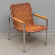 Armstoel met rotan zitting in vierkant stalen frame, model 725, ontwerp Dirk van Sliedrecht, uitvoering Gebroeders Jonkers -zitting wat donker geworden-