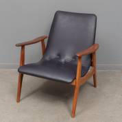 Afrormosia armstoel met donkerblauwe skai bekleding, ontwerp Louis van Teeffelen, uitvoering Wébé, jaren '50