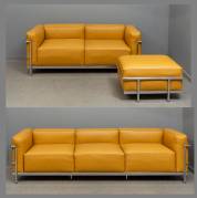 Zithoek in de stijl van Le Corbusier, bestaande uit: driezitsbank, tweezitsbank en een hocker, alle met okergele lederen bekleding en verchroomd metalen onderstel, uitvoering onbekend, Italië, modern, afmetingen circa: 64 × 235 × 71; 64 × 165 × 71; en 38 × 72 × 56 cm