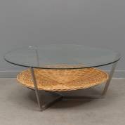 Ronde salontafel op metalen frame met glazen blad en rieten lectuurmand, jaren '60 -gebruikssporen-, 37 × Ø 92 cm