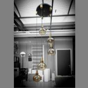 Vijflichts hanglamp met rookglazen kappen aan messing armaturen, vermoedelijk ontwerp Hans-Agne Jakobsson, jaren '60 -schilfertjes bij kap-aanhechtingen, hoogteverstelling plafondkapjes defect-, iedere lamp 24 × Ø 32 cm