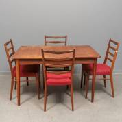 Vier afrormosia ladderstoelen met rode stoffering, model ST09, ontwerp Cees Braakman, uitvoering Pastoe, Utrecht, jaren '60, en bijpassende uitschuifbare teakgefineerde tafel -vlekken en gebruikssporen-, 73 × 125 × 82,5 cm