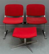 Tweezits bankje met rood stoffen stoeltjes op gegoten aluminium onderstel, in de stijl van Giancarlo Piretti, uitvoering onbekend, daarbij: een gelijkend krukje, bankje 75 × 105 × 58 cm