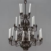 Hendrik Petrus Berlage (1856-1934), zwarte smeedijzeren kroonluchter met 28 zweepslagvormige armen, waarvan acht geëlektrificeerd, rond 1898 ontworpen voor de eetkamer van Villa Henny aan de Scheveningseweg 42, Den Haag. In 1913 hangt de kroonluchter in Museum Kröller aan het Lange Voorhout 1, Den Haag, waar de kunstcollectie van Anton en Helene Kröller-Müller werd getoond. Tot heden hing de kroonluchter in Villa Het Klaverblad, Edeseweg 206, Harskamp, een villa die deels verbouwd werd door Berlage in opdracht van de familie Kröller-Müller, daarna is de kroonluchter via vererving in bezit gekomen van de huidige eigenaar. Afmetingen 106 cm (zonder ketting) × Ø 73,5 cm