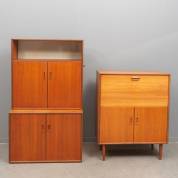 Teakhouten wandmeubel met houten grepen, bestaande uit drie delen, uitvoering Formule meubelen, Waddinxveen, jaren '60 -lichte gebruikssporen, één kastje met kapstokje aan de zijkant, pootjes van één kastje ontbreken-, 62 × 88 × 45 cm