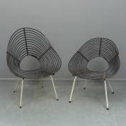 Paar gevlochten zwarte rotan fauteuils op grijs stalen onderstel, één hoger en één lager model, ontwerp Herman Broekhuizen, uitvoering Rohé Noordwolde, jaren '60 -gebruikssporen-