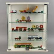 Vintage glazen vitrinekast met tien vrachtwagens en een raceautootje, waaronder Henschel, Corgi/Matchbox/Lesney en Siku -gebruikssporen-, laatste kwart 20e eeuw, 72 × 58,5 × 25 cm