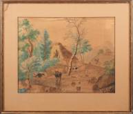 Hollandse School: bedrijvigheid op een boerenerf, aquarel, niet gesigneerd, eind 18e/19e eeuw -verkleurd, scheurtje rechts boven-, 48 × 37 cm