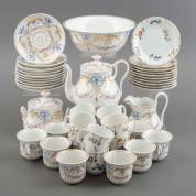 Twee diverse polychroom beschilderde theeserviesgedeeltes, 19e eeuw, bestaande uit: theepot, roomstel, suikerschaal, en acht theekopjes en elf schotels met het ene decor, en tien theekop-en-schotels met een andere decor, afmetingen theepot 15 × 17 × 12 cm