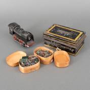 Divers kleingoed: zwart- en goudgeschilderd ijzeren geldkistje met drie compartimenten, uitvoering Chubb & Son, Londen, circa 1900 -lak sleets-, Märklin: locomotief R 880 -enkele onderdelen ontbreken-, en twee ovale spanen doosjes met circa 120 beschilderde vlakke tinnen soldaatjes uit de Franco-Pruissische oorlog, uitvoering J.C. Allgeyer, Fürth, circa 1870, afmetingen geldkistje 8 × 19 × 12 cm