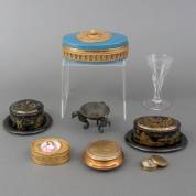 Divers kleingoed, waaronder: messing snuifdoos, het deksel gezet met ronde porseleinen plaquette met afbeelding van vrouw met sluier, paar tôle peinte koektrommels met chinoiseriedecor, en blauwgeglazuurde ovale doos met messing montuur, doos 16 × 10,5 cm