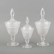 Paar gembercoupes en een kleiner exemplaar met ruitslijpsel, op stervormige voet, 19e eeuw -enkele kleine defecten-, grote coupes 36 × Ø 15 cm