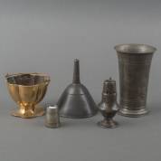 Gelobd messing wijwateremmertje, circa 1700 -reparatie aan wand-, tinnen beker, strooibusje, maatbekertje, en trechter, 18e en 19e eeuw, 17 cm hoog