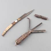 Drie diverse zakmessen: één Hans Busk's Riflemans's Knife, lengte 10,5 cm, één Zwitserse-stijl met diverse gereedschappen -één mes afgebroken-, en één vouwmes