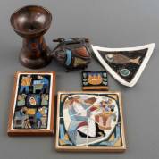 Zes stuks aardewerk: kandelaar, spaarpot en vier tegeltjes, alle ontwerp Henk Potters, grootste 10 × Ø 9 cm