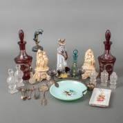 Divers kleingoed, waaronder: glazen schaaltje met 2e gehalte zilveren hengsel, kristallen parfumflacon met zilveren dop en voetje, paar kristallen karaffen met rood überfangdecor, en paar verzilverde tafelkandelaars -enkele defecten-, hoogte karaf 33 cm