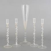 Grote glazen flûte met gegraveerde putto en spreuk 'Amor vincit omnia' -aanhechting voet gelijmd-, en vier glazen kandelaars met getorste stammen, vermoedelijk alle uitvoering Jos Böhm, hoogte flûte 40 cm