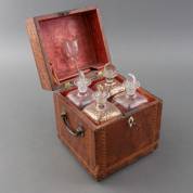 Mahoniegefineerde likeurkelder met geblokte biezen, binnenin met oorspronkelijke glazen flessen en glaasje, circa 1800 -vergulding van flessen en glaasje sleets; diverse fineerschades, sleuteltje wel aanwezig-, 22 × 19 × 18 cm